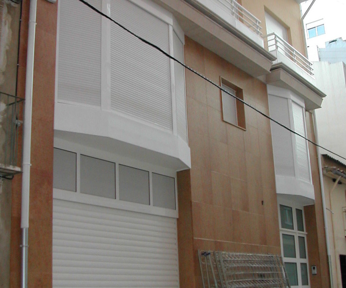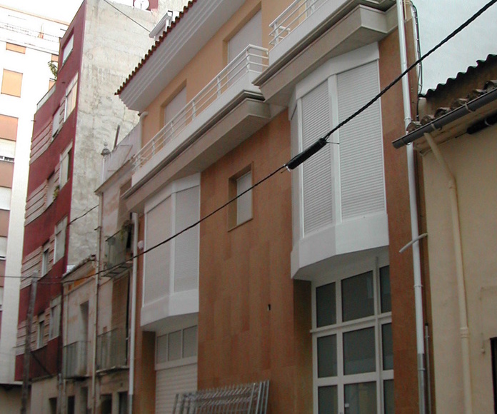 En la Vivienda Unifamiliar de la calle Calvario de Castellón se diseño una fachada acorde con la amplitud del solar, y por ello tiene una puerta de entrada amplia junto a una recia puerta de garage. El interior se ha diseñado a acuerdo a las mismas pautas.