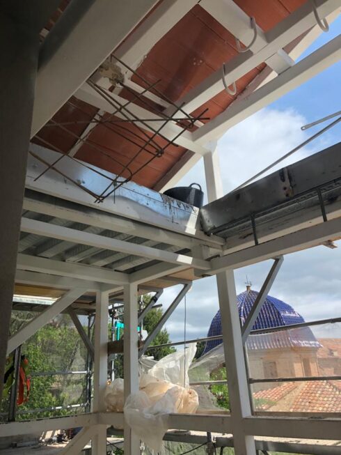 Los avances realizados en el proyecto, una vez acabada la estructura metálica, han sido el encofrar y hormigonar los forjados, pese a las dificultades climatológicas y de situación de los forjados.